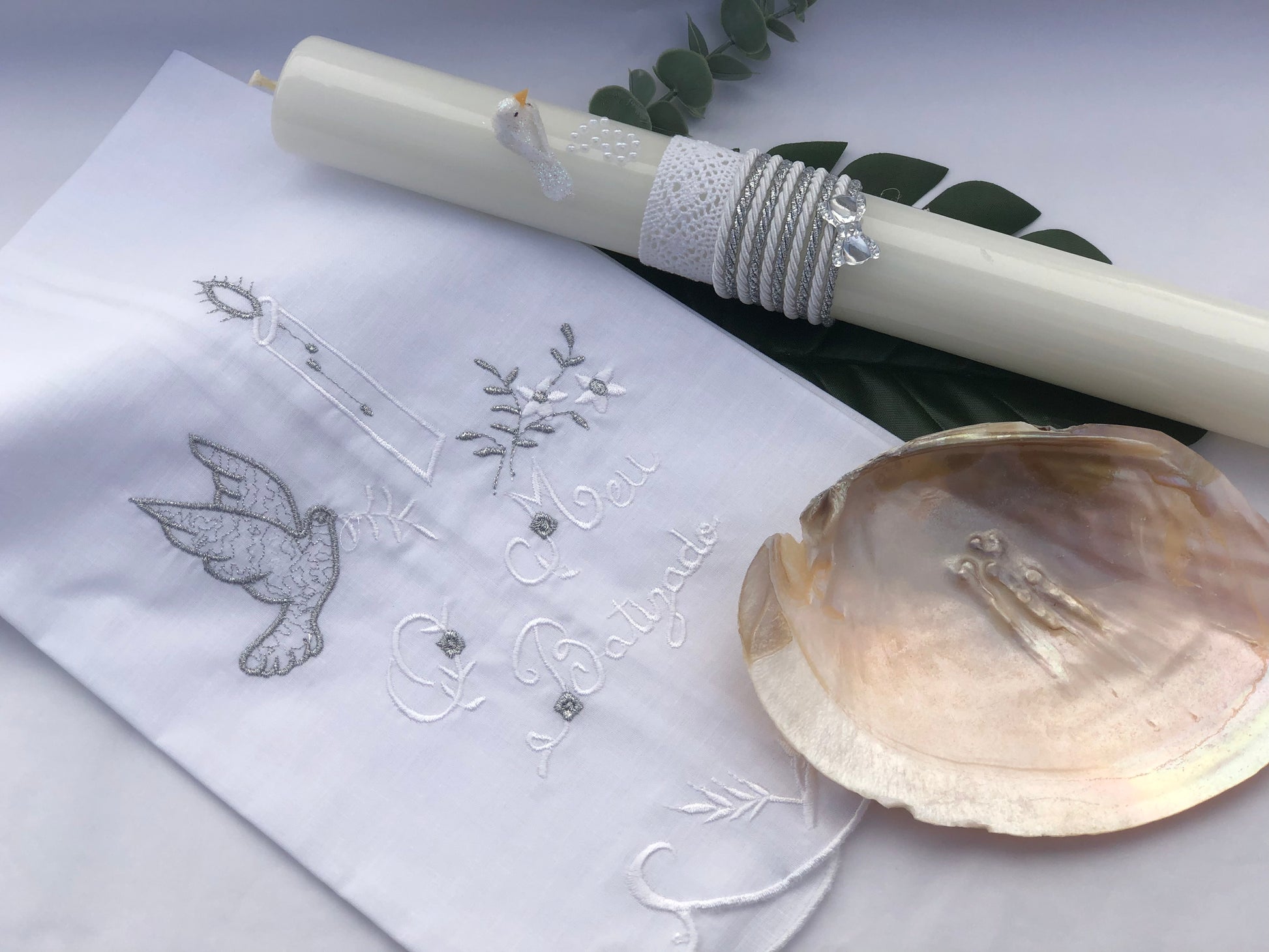 Lindíssimo conjunto de batismo composto por vela, concha e toalha (pode ser vendido em separado)